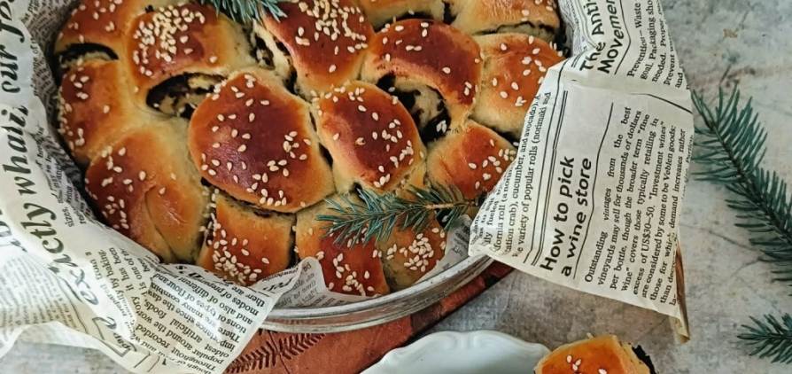 Grzyby suszone ugotować i zmielić na drobnych oczkach. Pieczarki zetrzeć na tarce, cebulę pokroić w drobną kostkę. Na patelni rozgrzać masło, zeszklić cebulę i dodać grzyby. Chwilę smażyć, doprawić solą i pieprzem. Ciasto rozwałkować na kwadrat, posmarować farszem, zwinąć jak roladę. Następnie pokroić na mniejsze kawałki, ułożyć w blaszce, posmarować jajkiem i posypać sezamem. Odstawić ponownie do wyrośnięcia. Ciasto wstawić do piekarnika nagrzanego do 180 st. C i piec ok. 25 minut.